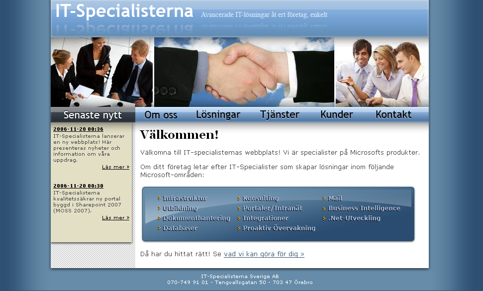 Vårt uppdrag från IT-Specialisterna var att leverera en total uppdatering av deras webbplats. Från en statisk Flash som enda innehåll gick vi över till en komplett webbsajt enligt kundens önskningar. ASP.NET och SQL Server som ryggrad var ett självklart val, inte bara på grund av kundens Microsoft-profil. Designen skulle vara snygg, se avancerad ut men ändå enkel, förstärka Microsoft-banden, vara lättläst, och bara innehålla det absolut nödvändigaste.